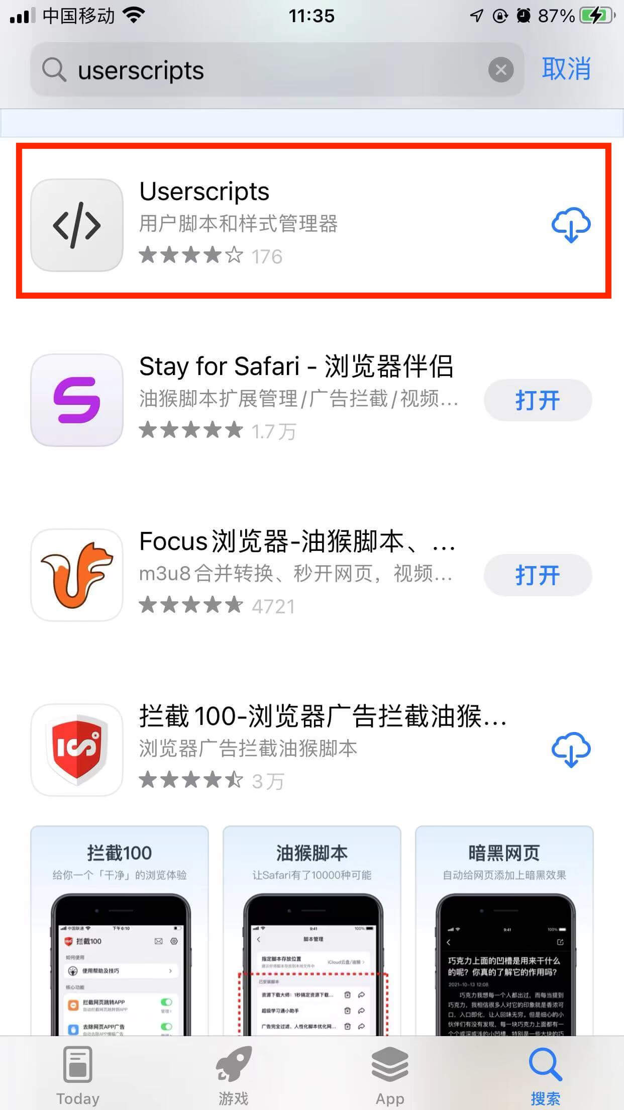 1.打开"App Store",搜索“userscripts”,然后进行安装。