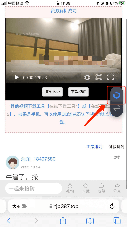打开任意帖子,点击第一个浮动按钮,稍等片刻,就可以看到解析出来的视频了。
