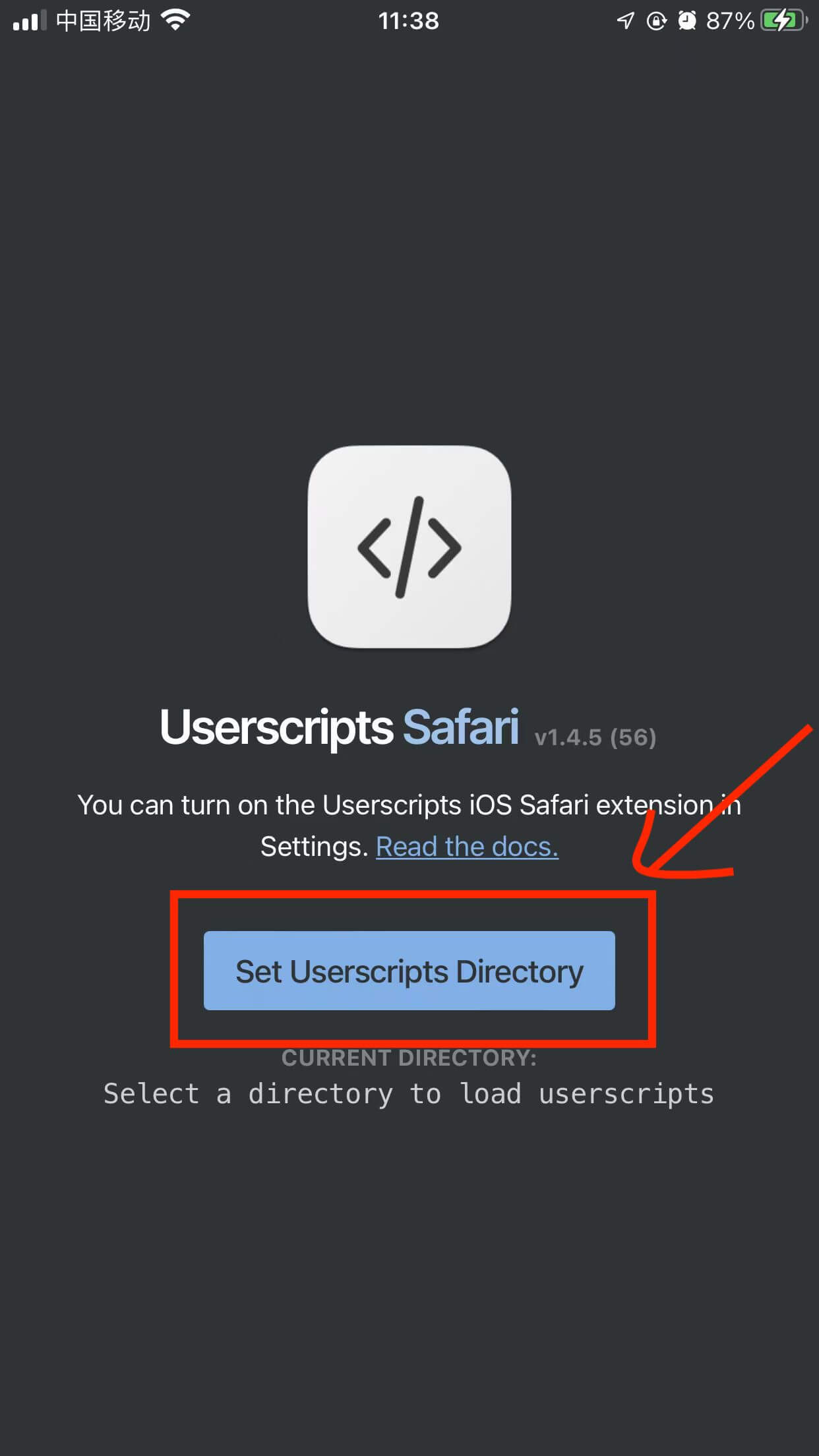 2.打开安装好的【userscripts】应用,点击【Set Userscripts Directory】。