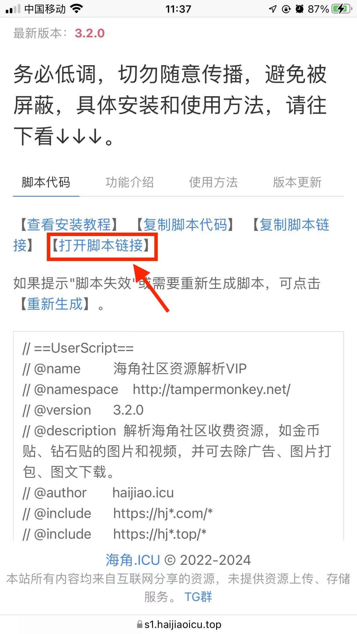 - 在我们网站中,找到脚本页面,然后点击【复制脚本链接】(注意,这里是复制脚本"链接"不是复制脚本)。