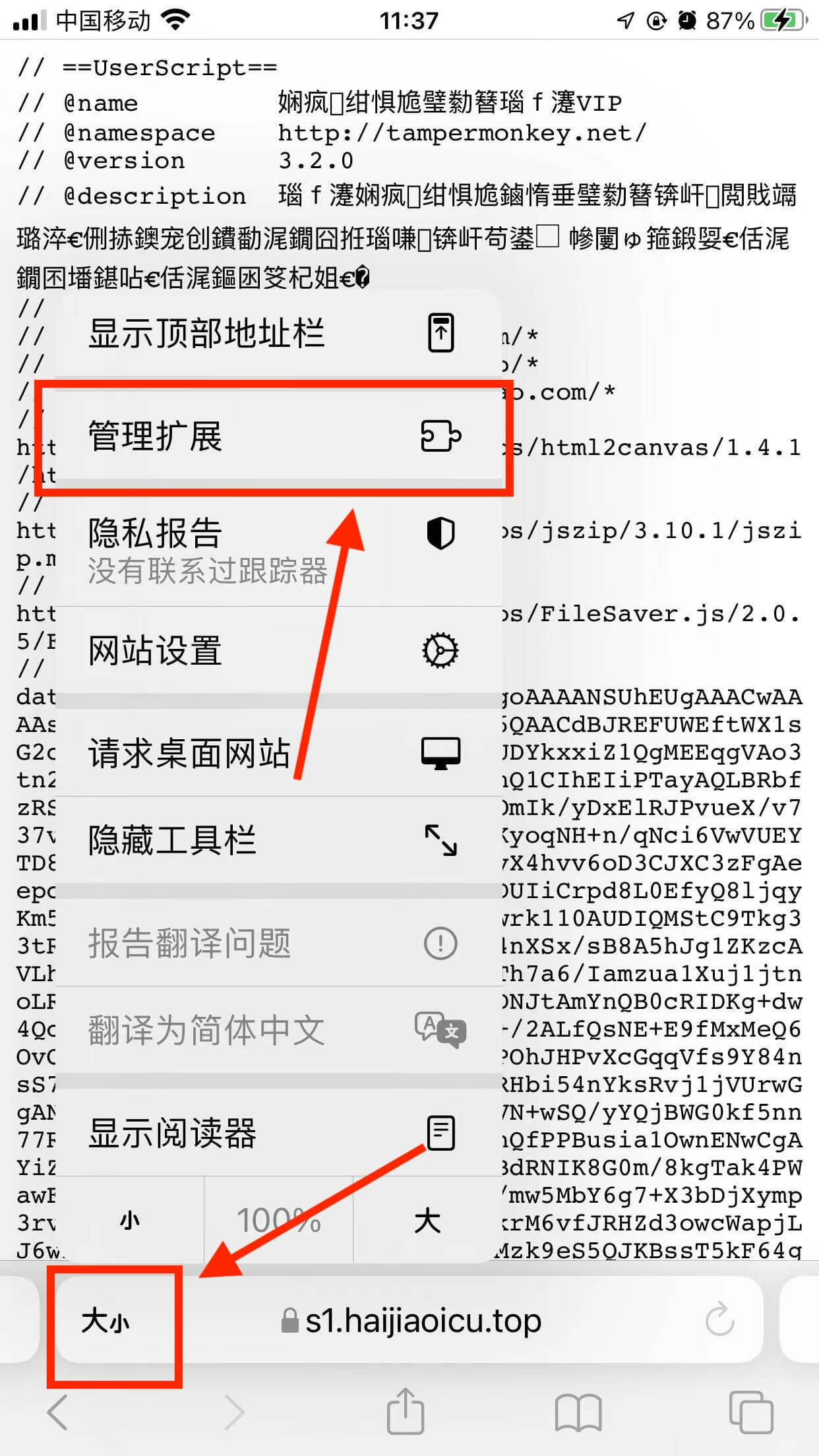 5.在脚本页面, 点击Safari浏览器左下角【大小】, 然后点击【管理扩展】。